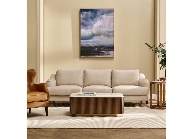 Encased in a hand-painted gold natural timber shadow box frame, it adds warmth and rustic charm, perfect for tranquil modern rustic offices or calming coastal living spaces.
