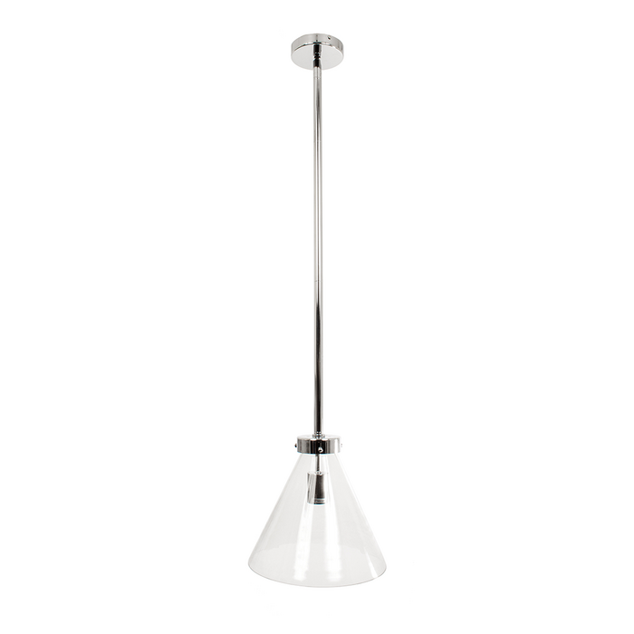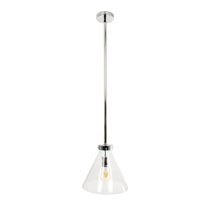 The Gadsden Pendant features a glass conical shade evoking early-20th-century industrial lighting, designed to showcase the warmth of Edison-style filament bulbs.