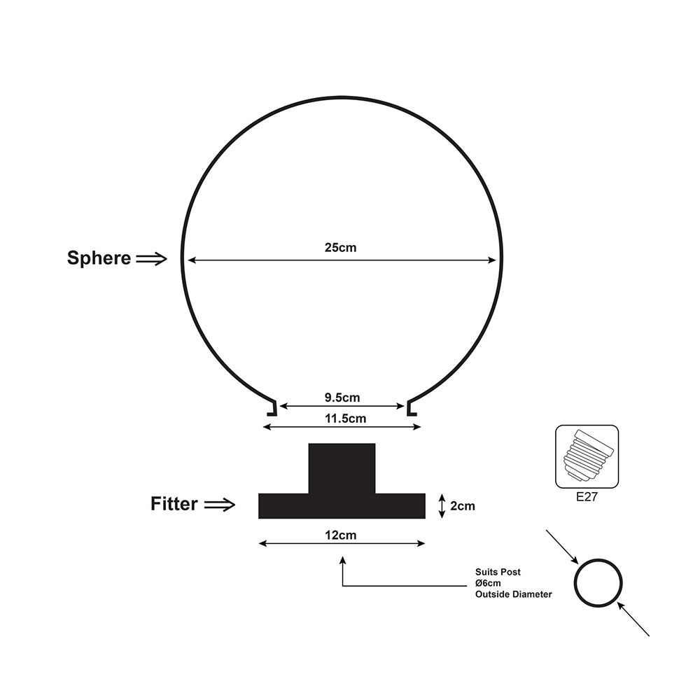 Galactic opal acrylic outdoor post top is available in six sizes from 20-50cm in diameter. Supplied complete with a black ABS plastic base which fits onto a 60mm (outside diameter) post.