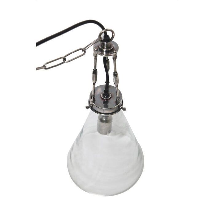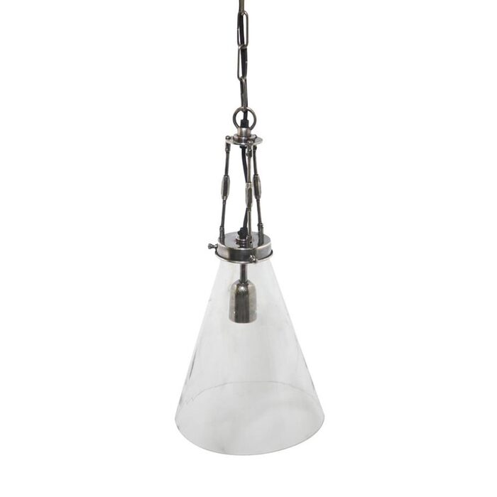 The Galveston's conical pendant shade suspends elegantly from a chain drop in antique Brass finish.