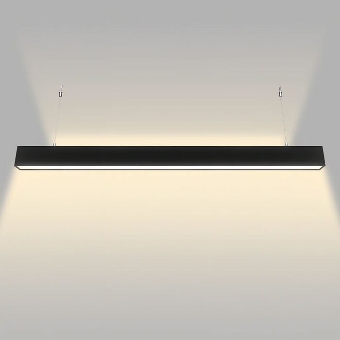 Modern linear pendant light with selectable wattage and CCT via an integrated DIP switch.