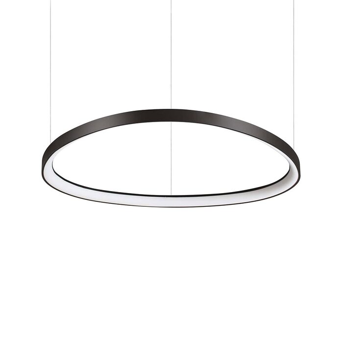 Modern LED chandelier with powder coated or plated metal canopy and lampshade.