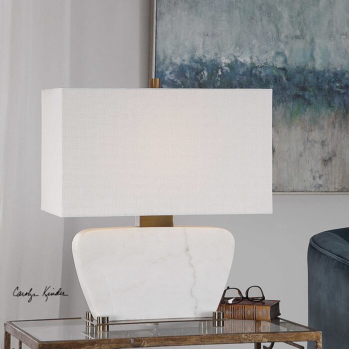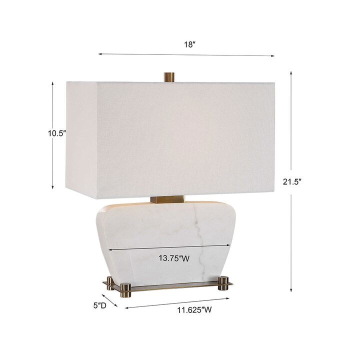 A sleek, modern style exudes from this white marble table lamp that features subtle gray veining, accented with antique brass plated details that add to this simple, yet eye-catching design.