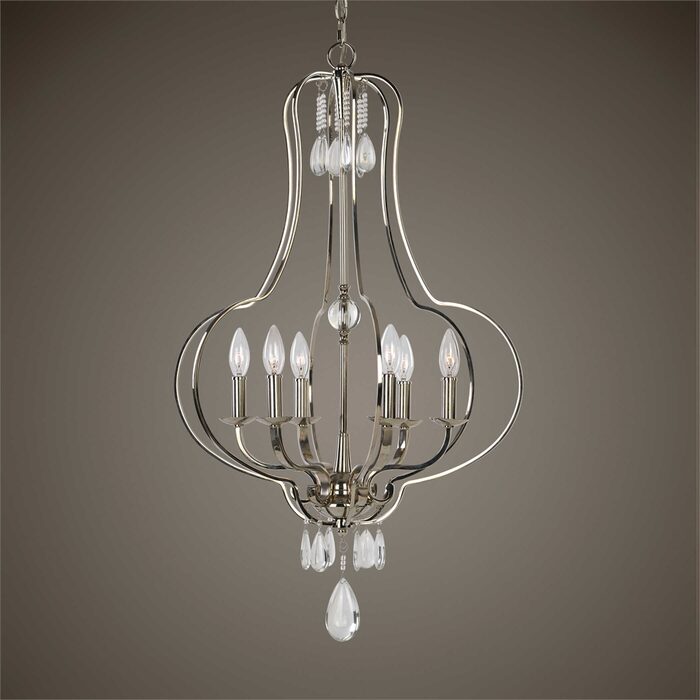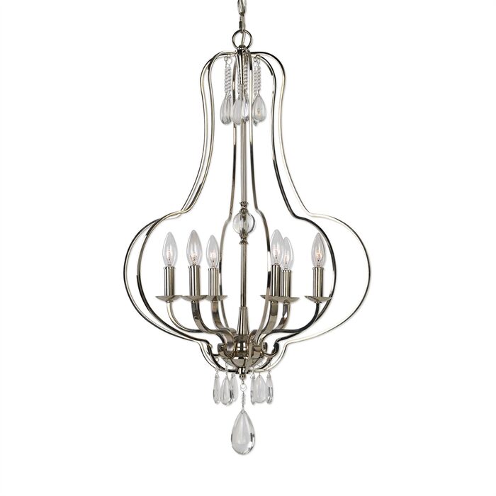 Graceful 6 Lt. polished nickel square arm chandelier with the petite arms floating on the outside of the center candle cluster in a unique genie bottle shape enhanced with clear glass drop accents at both the top and bottom of the chandelier.