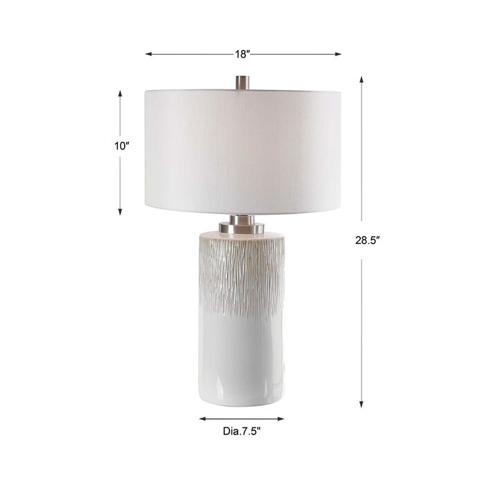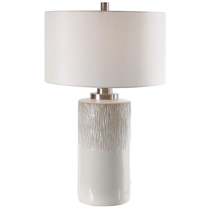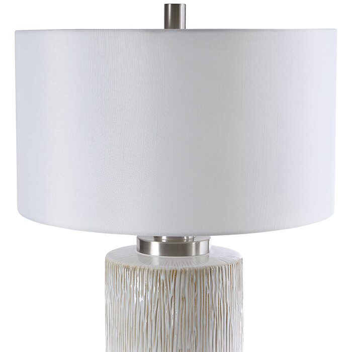 This lamp showcases an aged white ceramic base accented with charcoal flecks and textured beige drip details.