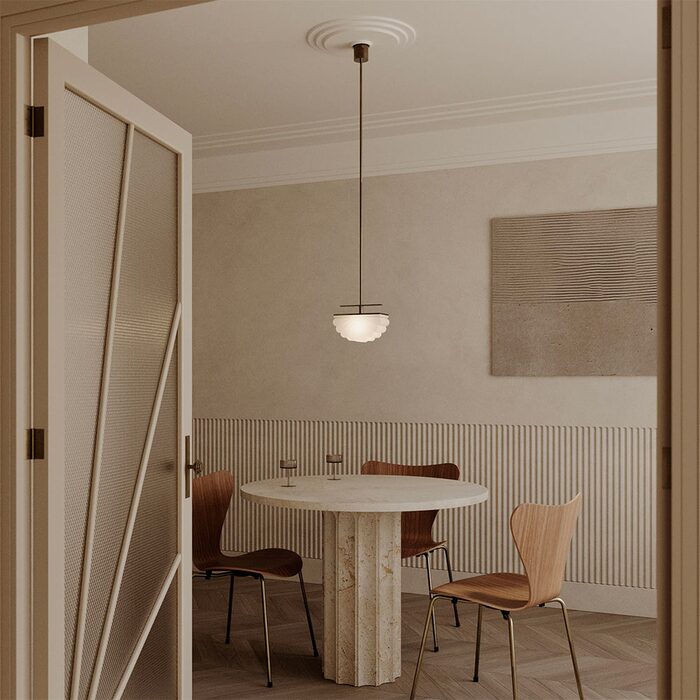 Its gentle arc enhances the fluidity of the design, diffusing light elegantly while adding a sense of movement and balance to any space.