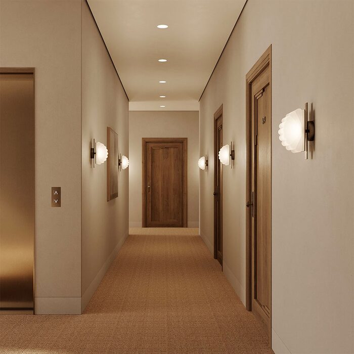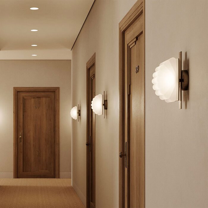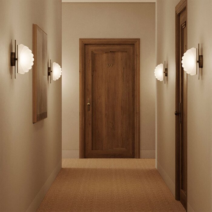 Gina Wall Light by Aromas, designed by Pepe Fornas, features a beautifully curved, semi-circular shade that creates a soft, sculptural silhouette.