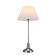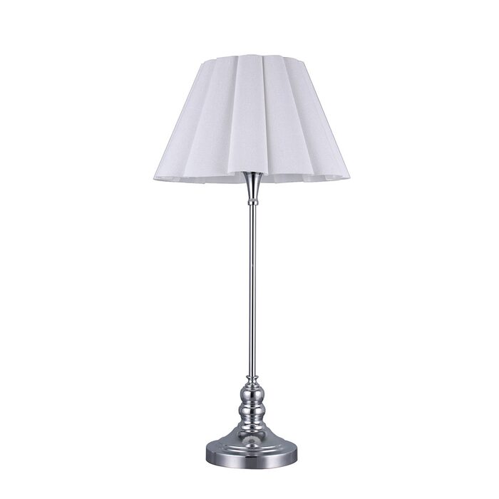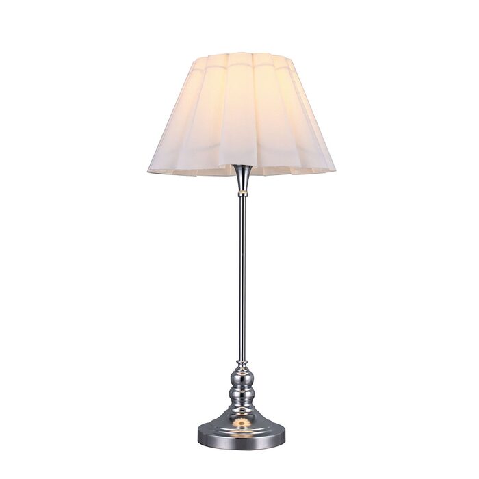 The Giselle Table Lamp combines vintage elegance with modern functionality, featuring a chrome metal base and a white linen umbrella-form shade that adds a unique and sophisticated touch to any bedroom, living room, or home office.