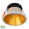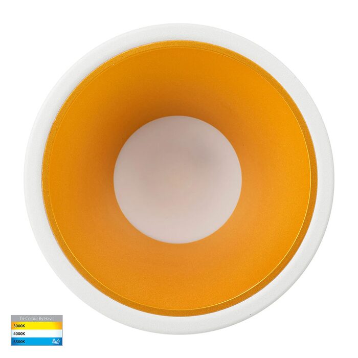 The Havit HV5528T-WG Gleam is a 9W fixed, recessed LED downlight featuring a white polycarbonate frame, gold insert for low glare, and tri-colour (3000K/4000K/5500K) switchable tech.