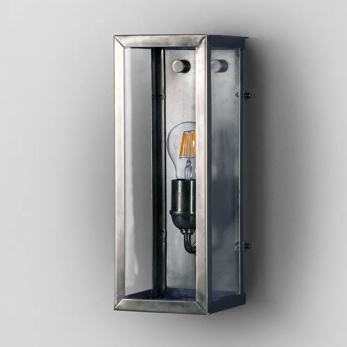 Goodman outdoor wall lamp features an outer frame of black/silver/brass finish metal in rectangular shape and clear glass.