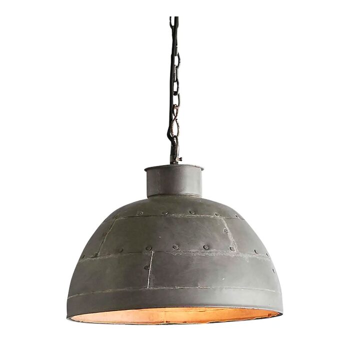 A riveted dome pendant in two rustic finishes. This pendant is designed to patina over time for a vintage aesthetic.