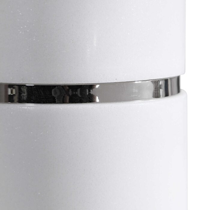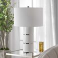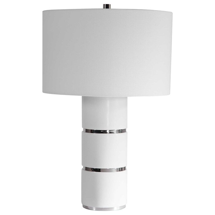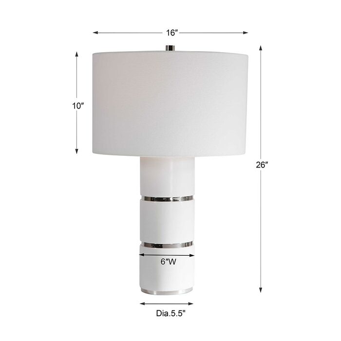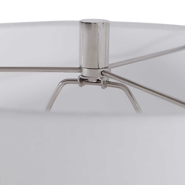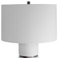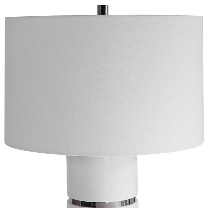 Modern and elegant, this table lamp is made from granulated white marble that accurately replicates the look of Thassos marble separated with polished nickel plated details.
