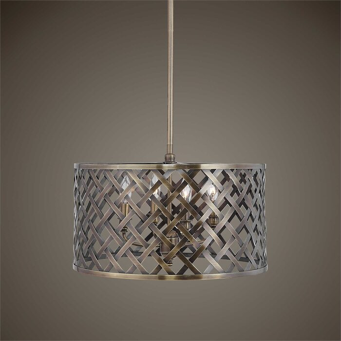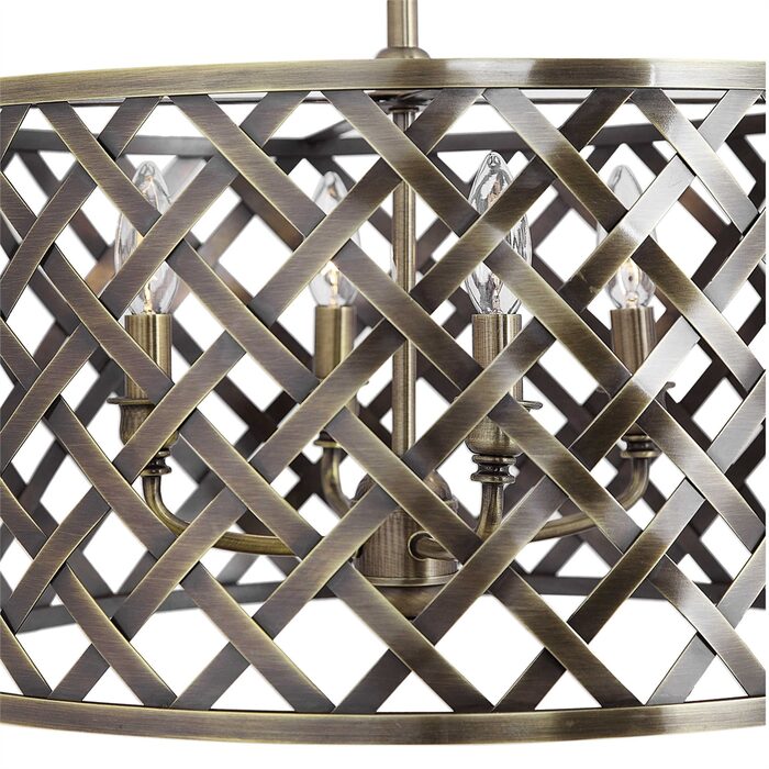 With a handwoven crisscrossed latticework shade in an aged brass finish we have a wonderful transitional pendant.