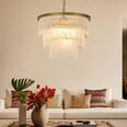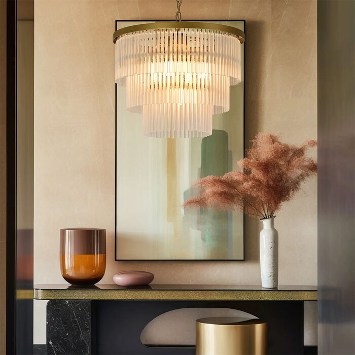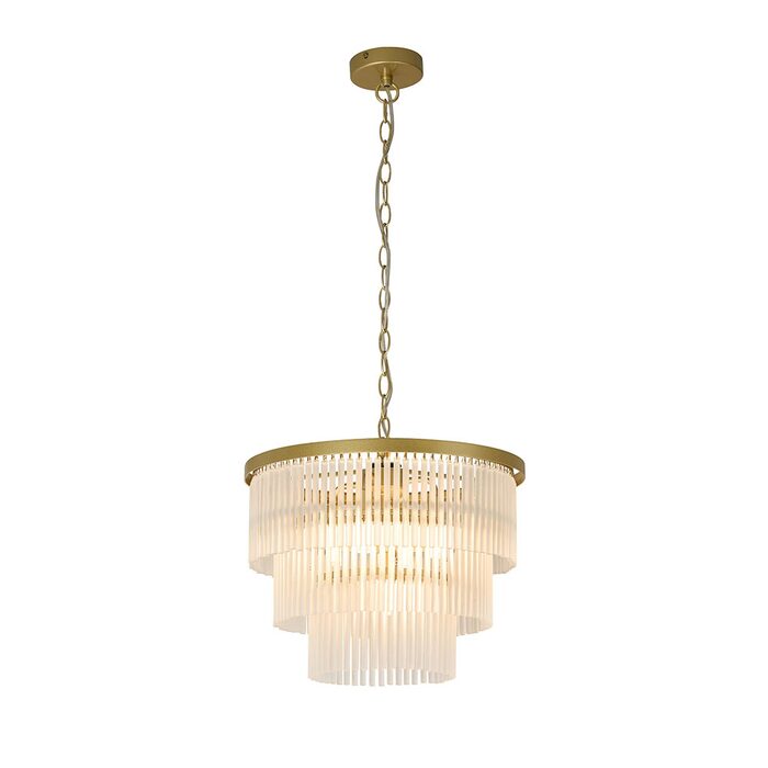 3-tier gold rings, each adorned with an assortment of frosted glass rods, giving the fitting luxury sophisticated look.