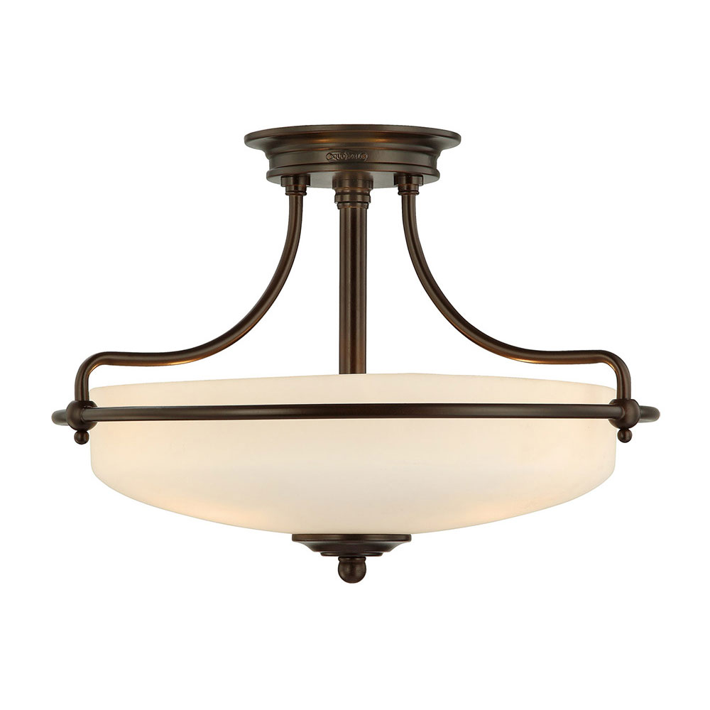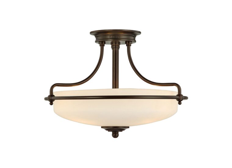 It is held in place by softly curved arms and is available in four finishes: Antique Nickel, Polished Chrome, Palladian Bronze and Weathered Brass.