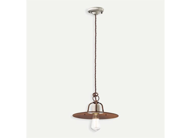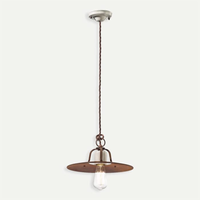 The rusted iron shade with cracked ceramic lamp detailing and rustic cable makes this a beautiful industrial light.