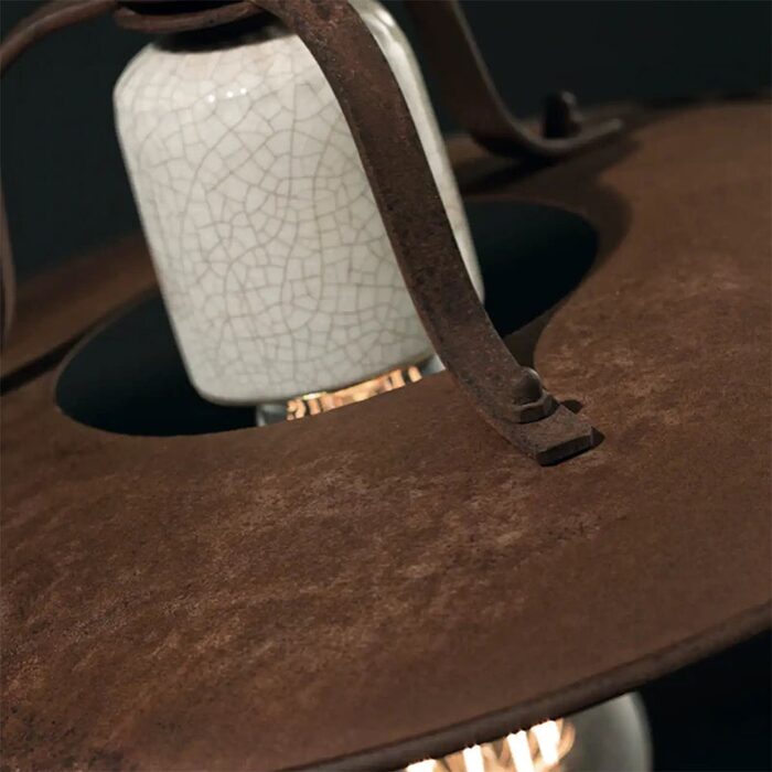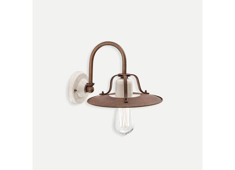 Vintage-inspired wall light with an industrial vibe. Rusted iron shade with cracked ceramic wall bracket and lamp detailing.
