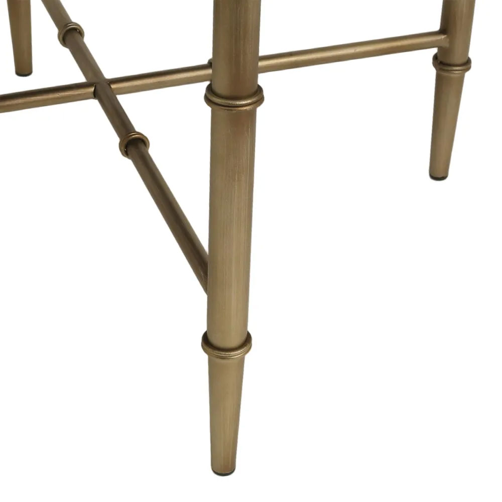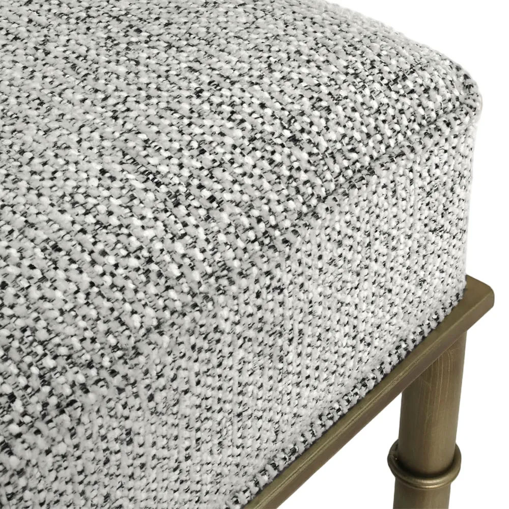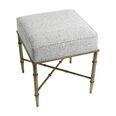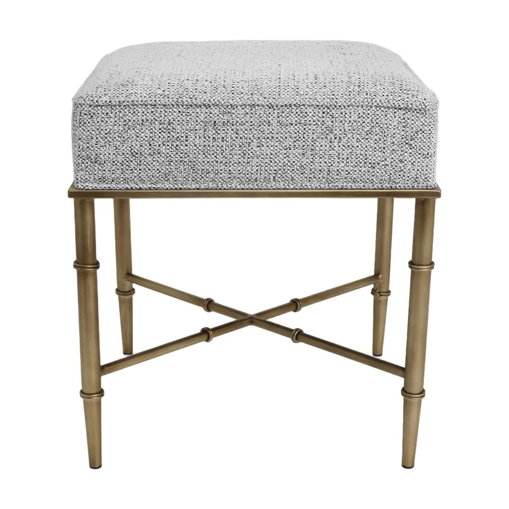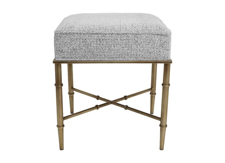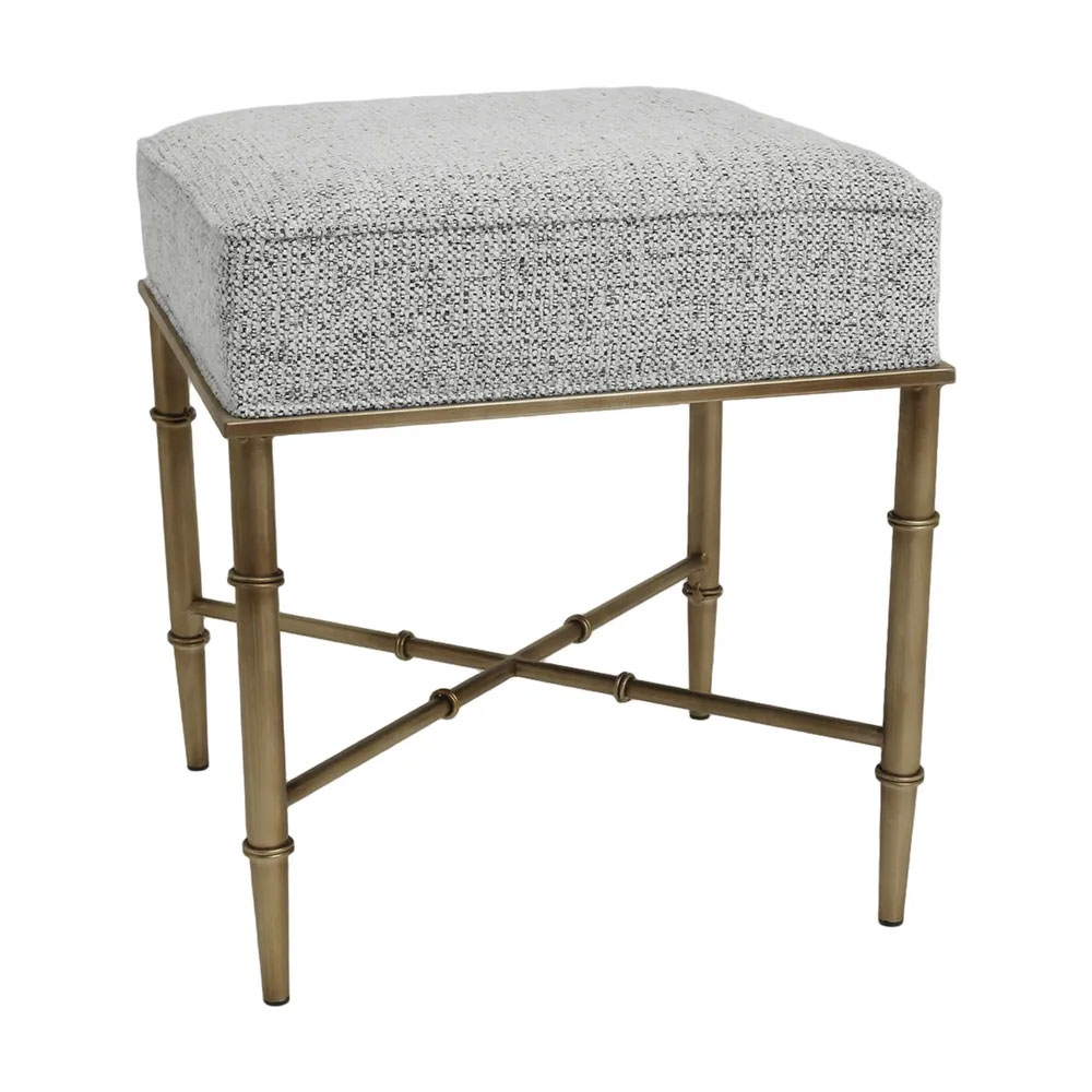 Characterised by its antique brass-finished iron frame with bamboo-inspired detailing, this collection includes both ottomans and stools in natural and salt-and-pepper woven upholstery.