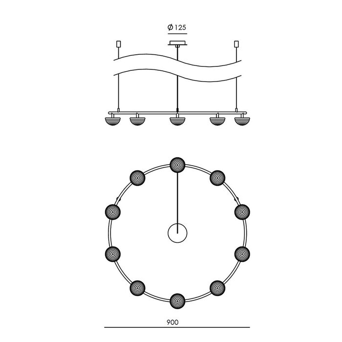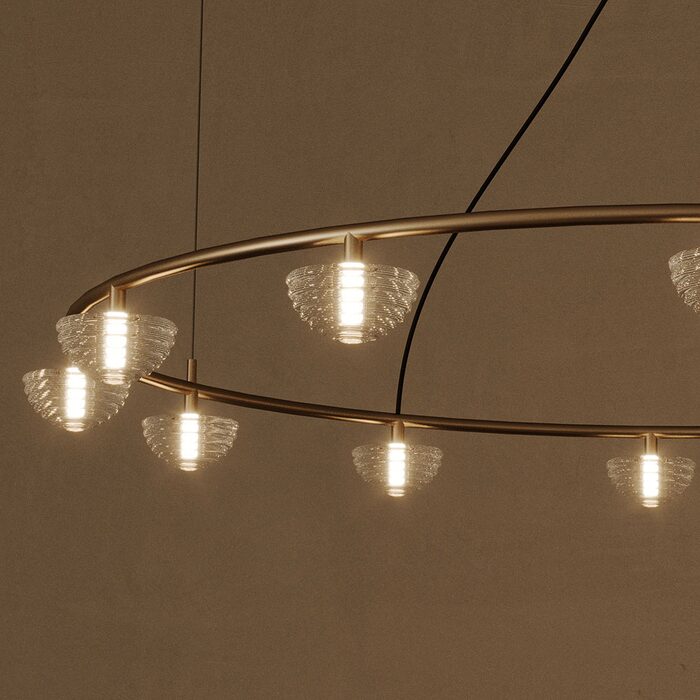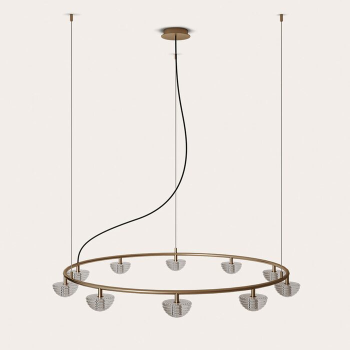 Hado Chandelier by Aromas, designed by Pepe Fornas, features dome-like, lined glass shades reminiscent of the optic rhythm seen in water ripples.