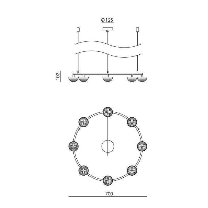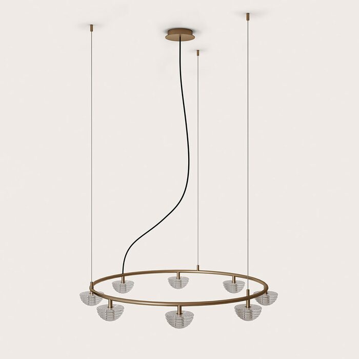 Hado Chandelier by Aromas, designed by Pepe Fornas, features dome-like, lined glass shades reminiscent of the optic rhythm seen in water ripples.