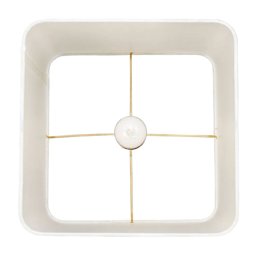 The geometric design is perfectly paired with a sleek, rectangular white faux linen shade, gently diffusing light to create a warm and welcoming atmosphere.