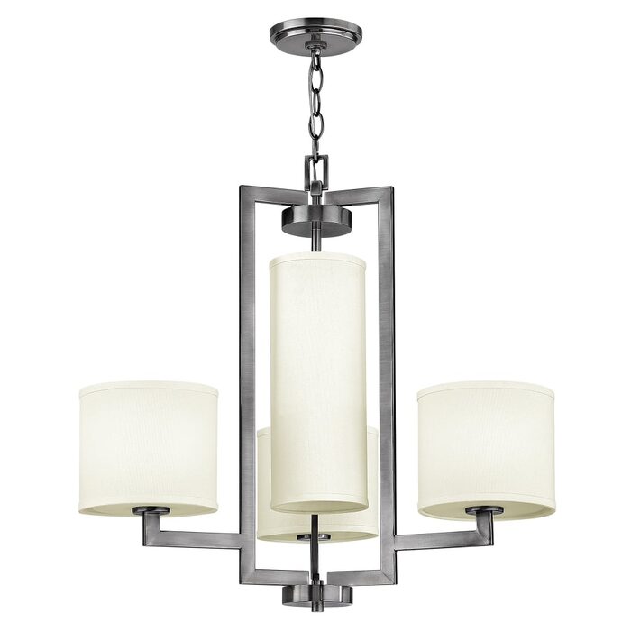 The minimal rectangular frame, paired with a decorative acrylic etched bottom lens, is softened by a contemporary off-white linen drum shade.