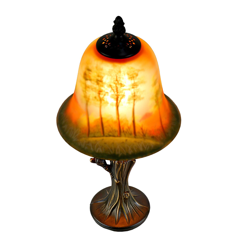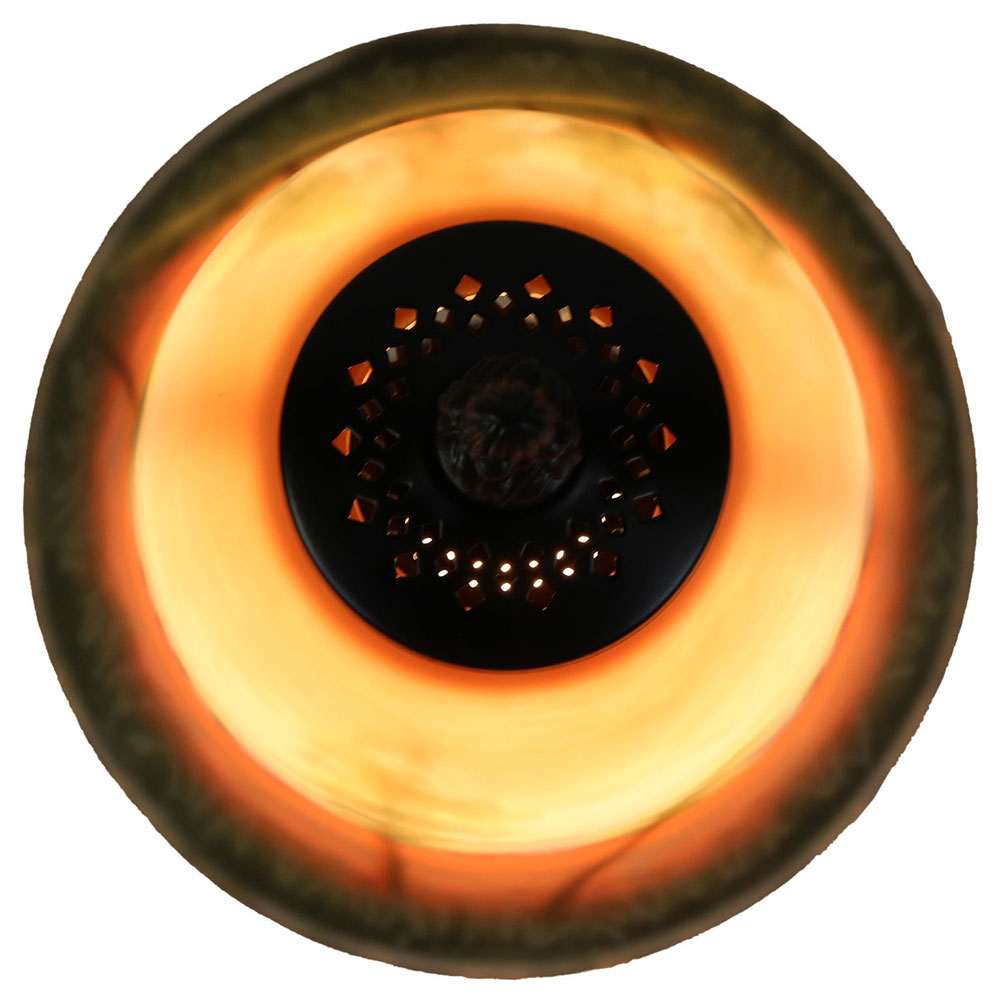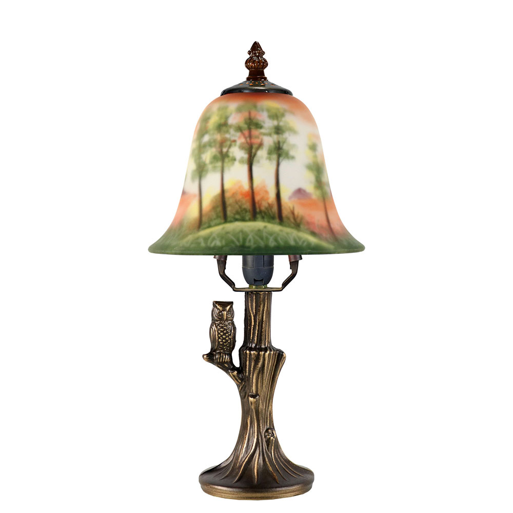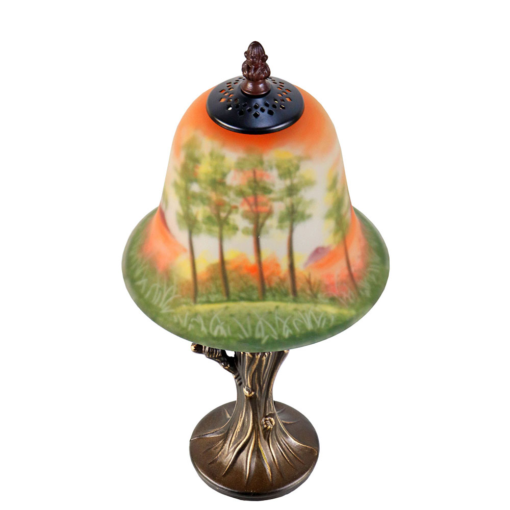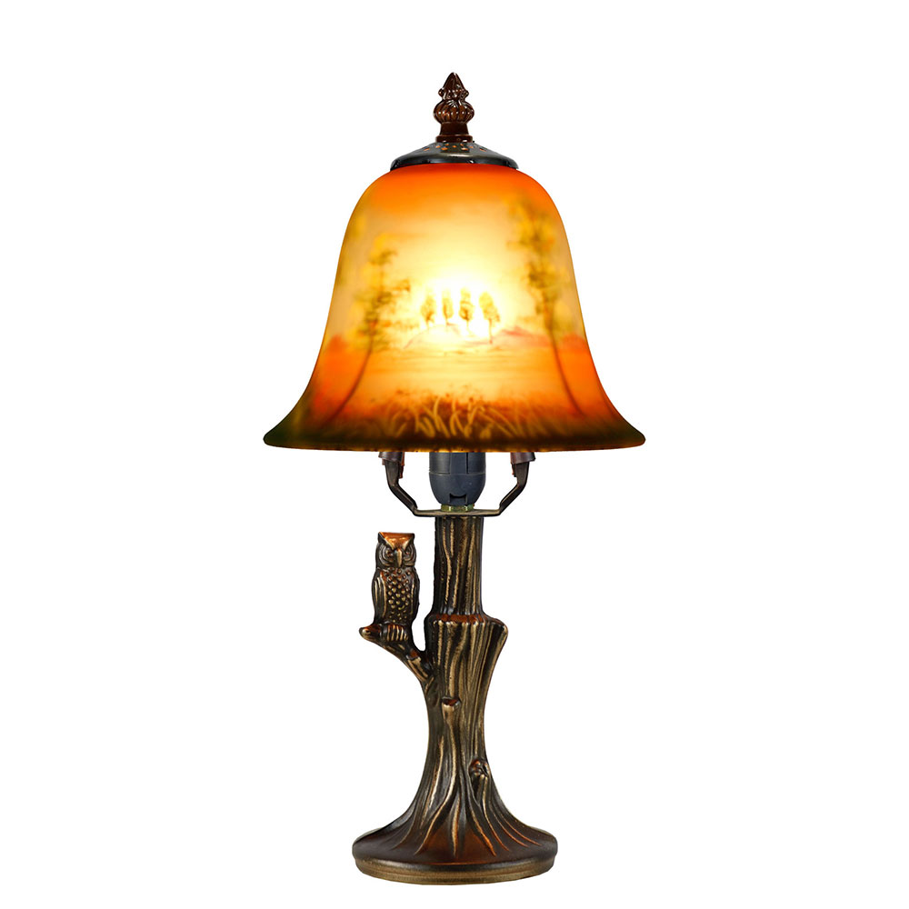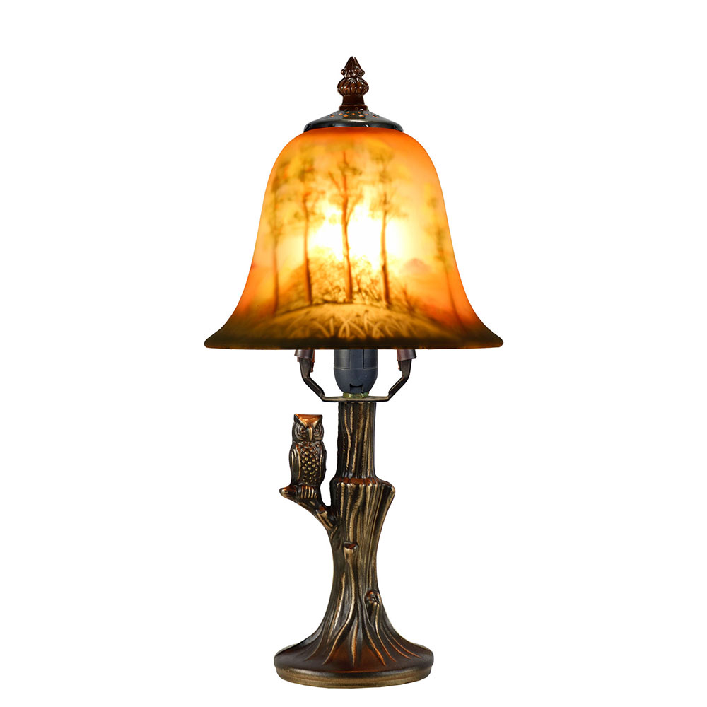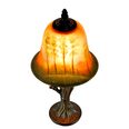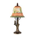 This beautiful lamp features a handcrafted, genuine stained art glass shade combined with a resin base, carved in a traditional design with a brown neutral color to juxtapose the lively art glass shade for maximum impact.