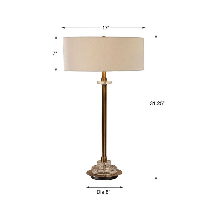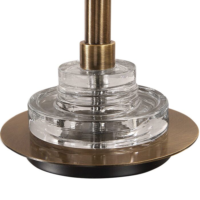 Petite steel column, finished in a plated antique brass, resting on a thick glass insulator, paired with a delicate crystal accent.