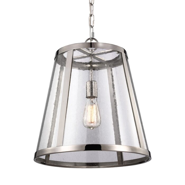 Combining the traditional profile of a tapered shade with on-trend clear seeded glass, the sleek frame and the square-linked chain give the Harrow pendant light collection by Feiss an elevated, contemporary transitional look.