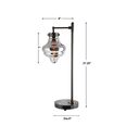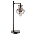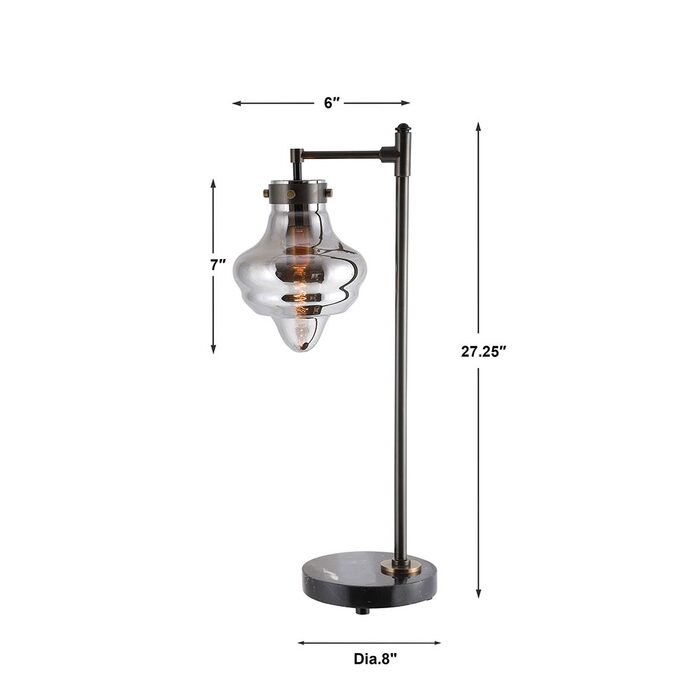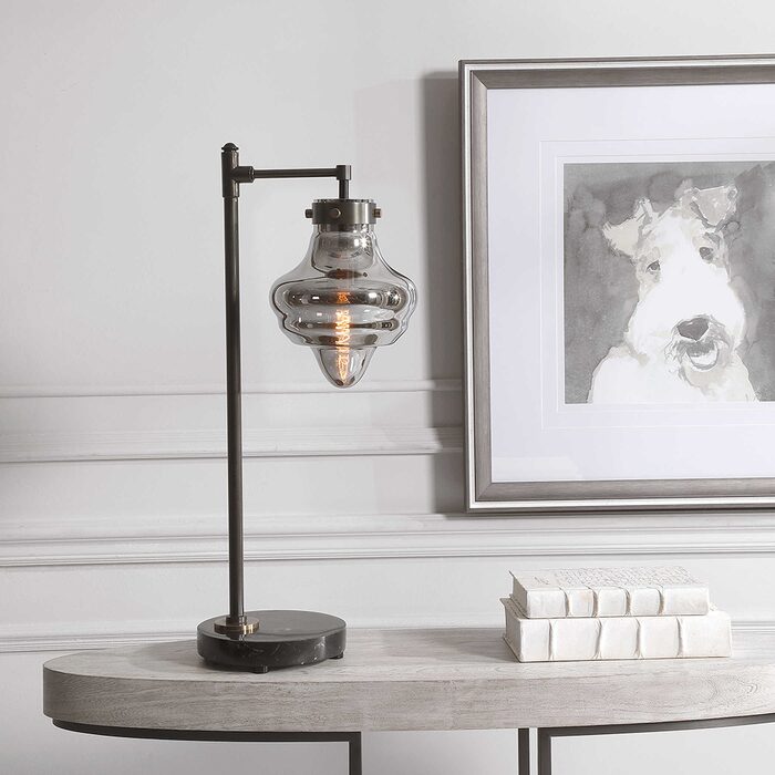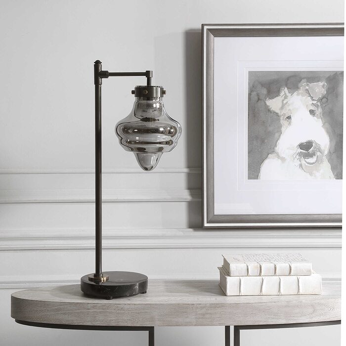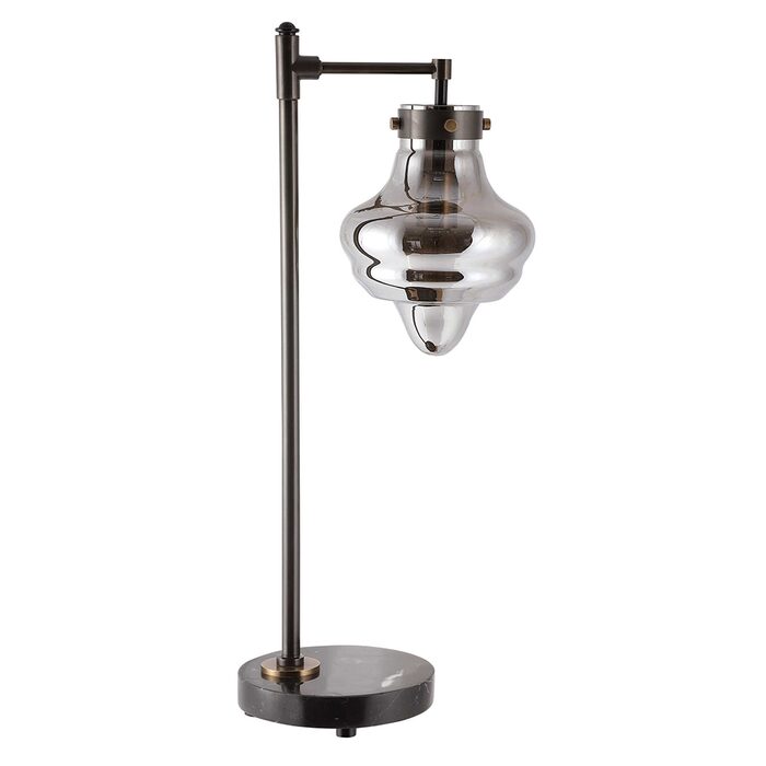 Influenced by industrial style, this accent lamp has a solid steel base finished in a dark oxidized bronze, accented by a thick black marble foot and antique brushed brass details.