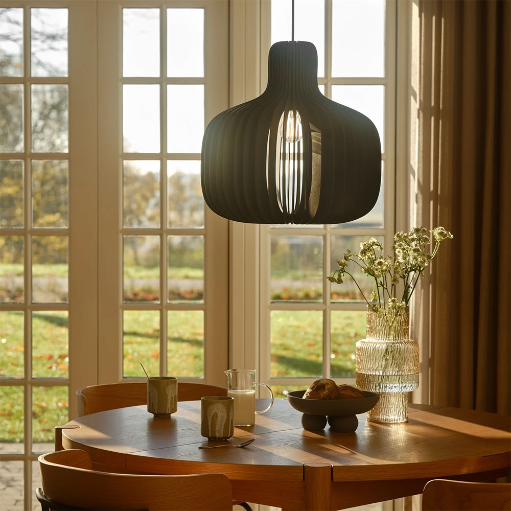 Hazo is an open pendant light, where the wooden structure invites nature inside and creates a beautiful interplay of light and shadow.