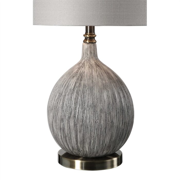 Organic gourd shaped ceramic with a heavily textured surface, finished in an old ivory with aged black undertones, accented with burnished brass plated details.