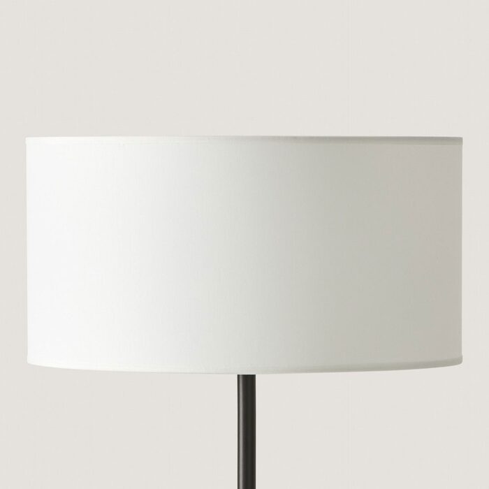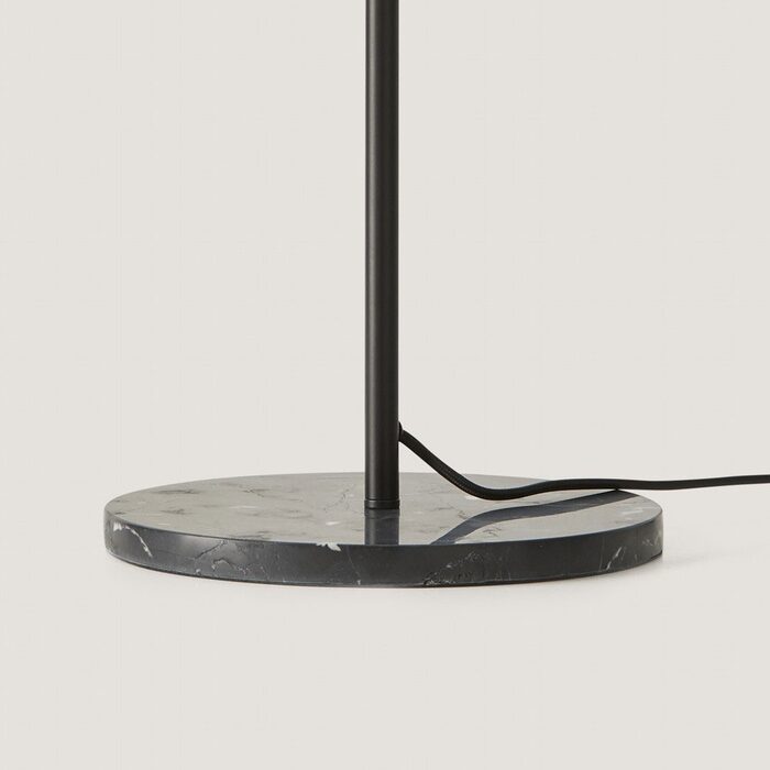 The dark marble base evokes a luxurious sturdiness and weight, while the rounded fabric shade presents a classic flair.