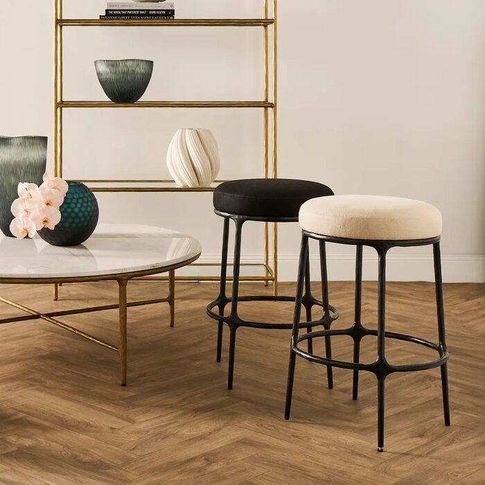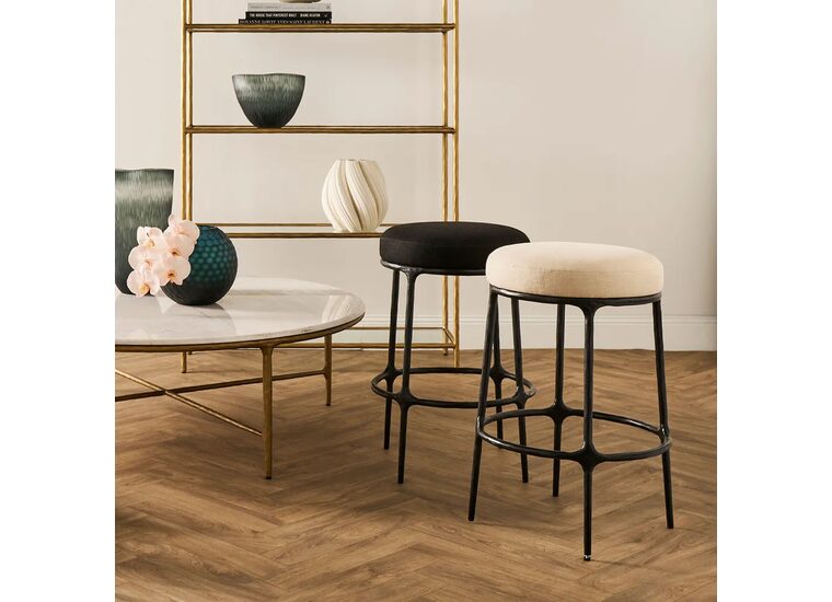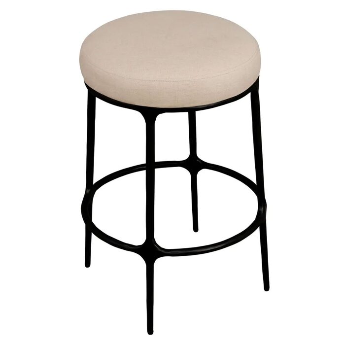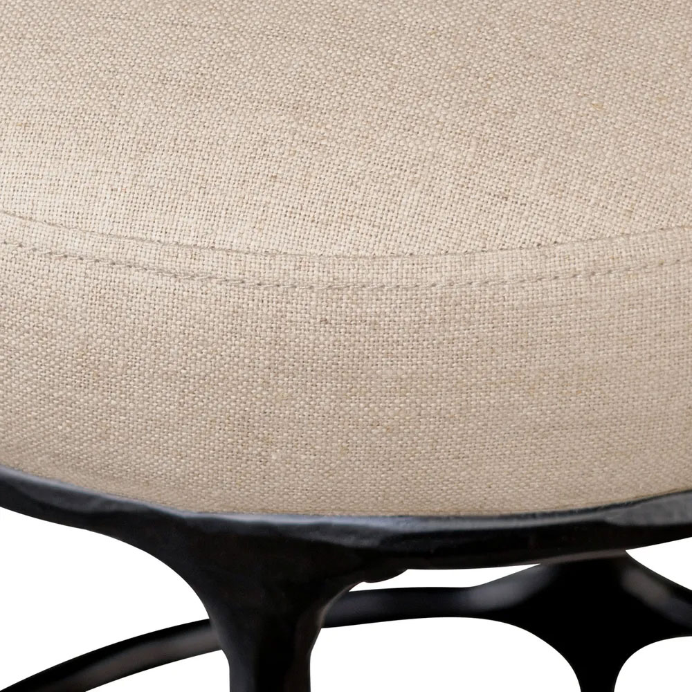 Experience timeless elegance with our Heston Kitchen Stool collection, seamlessly blending the rustic charm of hand-forged solid iron frames with organically smoothed upholstery in black 100% cotton or natural 100% linen.