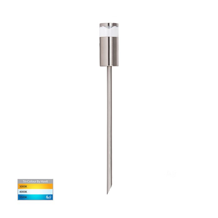 Featuring a fixed spotlight head with a Perspex lens, an included 5W Tri-Colour (3000K/4000K/5500K) LED MR16 globe, and an IP65 weatherproof rating for landscape accent lighting, requiring a suitable 12V DC driver.