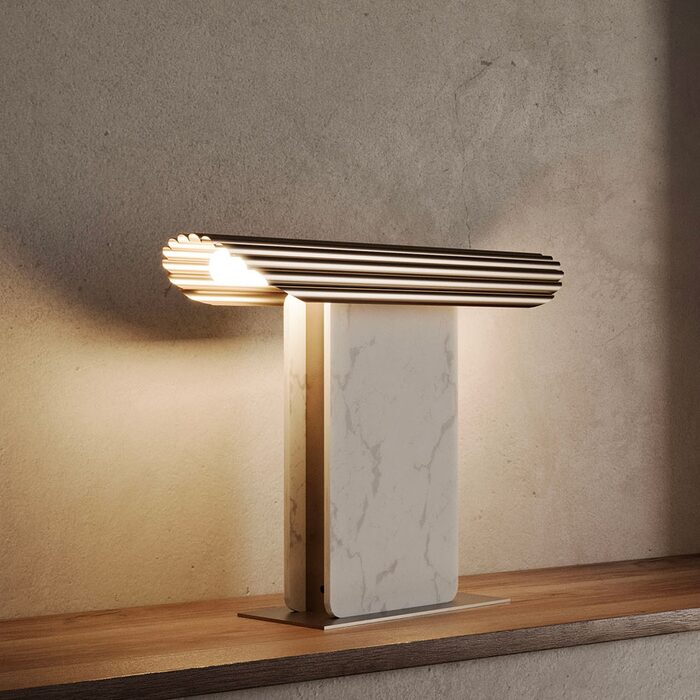 Hold Table Lamp by Aromas captivates with its striking curved steel shade, defined by a concertina-like texture that enhances its sculptural presence.