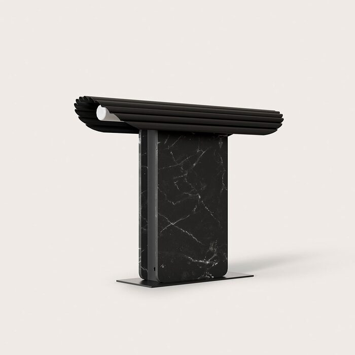 Hold Table Lamp by Aromas captivates with its striking curved steel shade, defined by a concertina-like texture that enhances its sculptural presence.