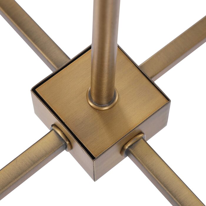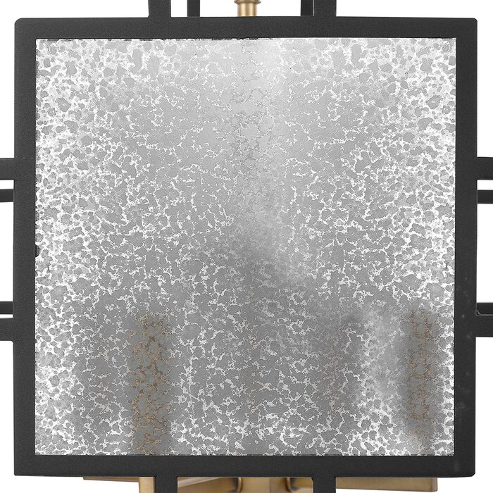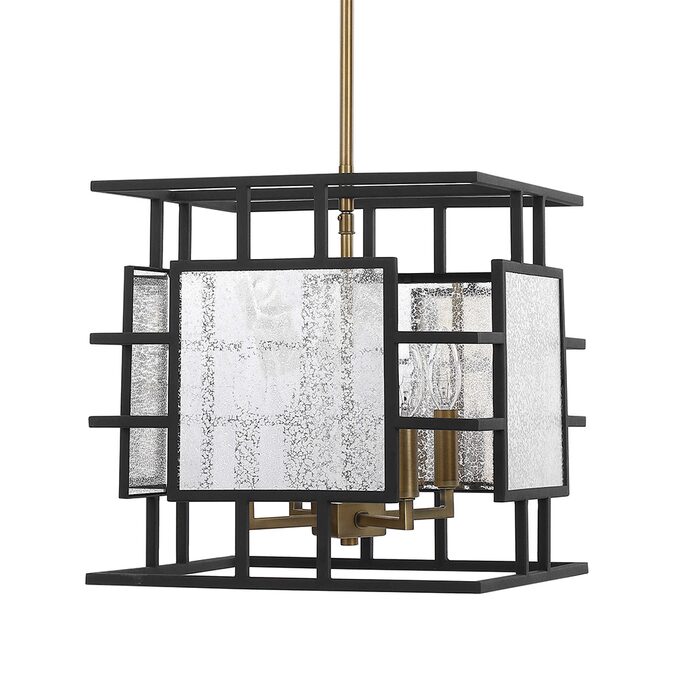 Distressed mercury glass panels enhance the clean line of this 4 Lt. pendant featuring a combination finish of sanded black and antique brass giving an elegant yet orderly look. 4-60 watt max, candelabra sockets.