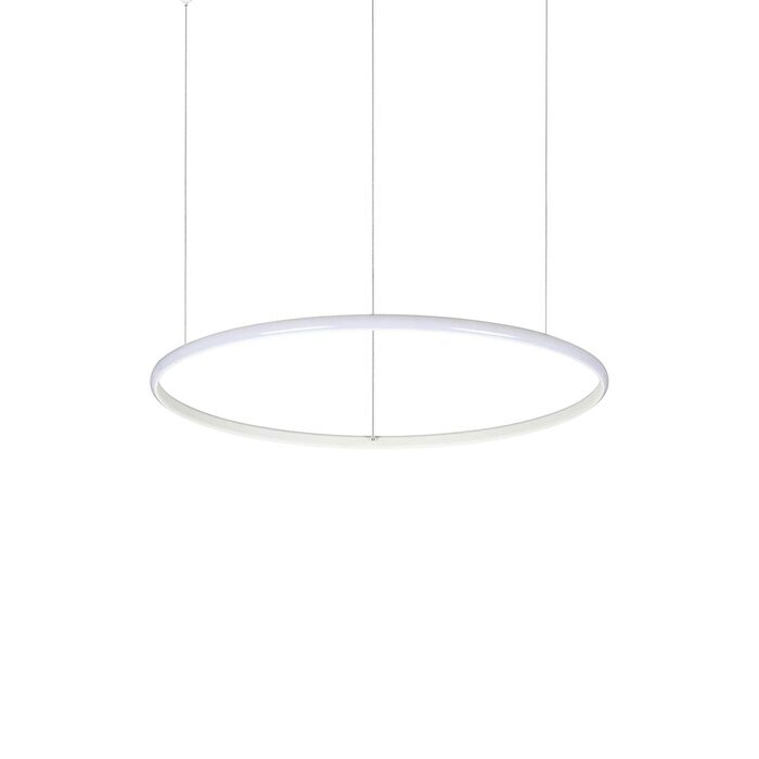Ring-shaped suspension lamp with powder coated metal canopy and frame with white finish.