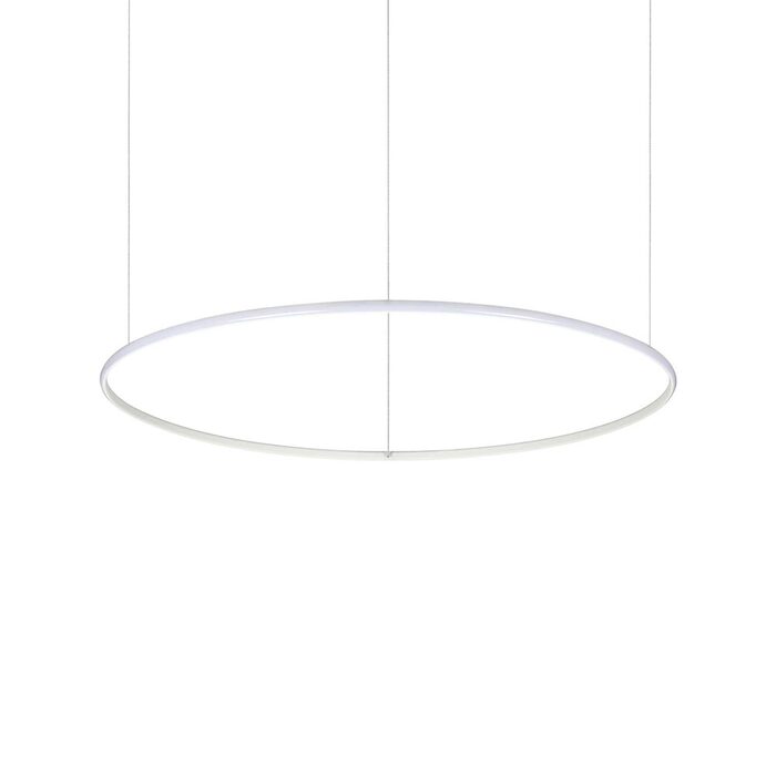 Ring-shaped suspension lamp with powder coated metal canopy and frame with white finish.