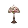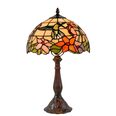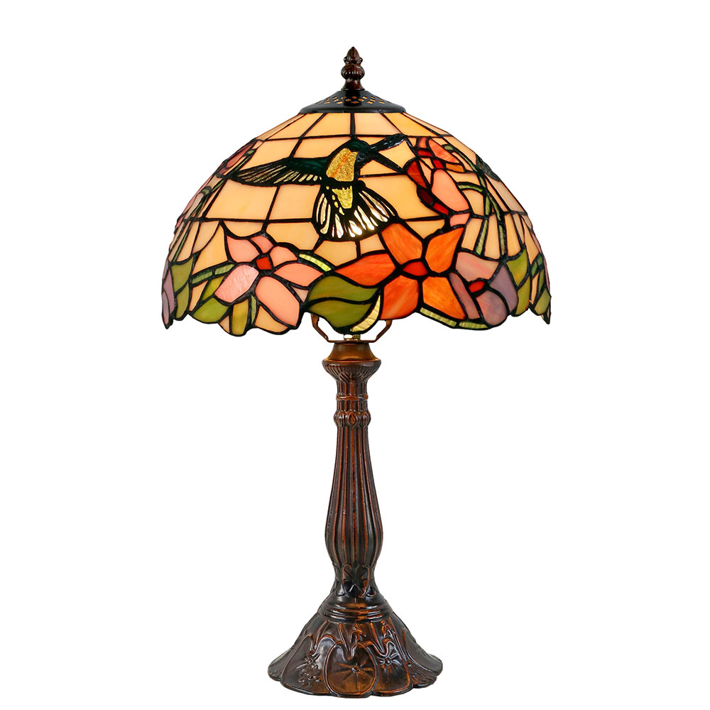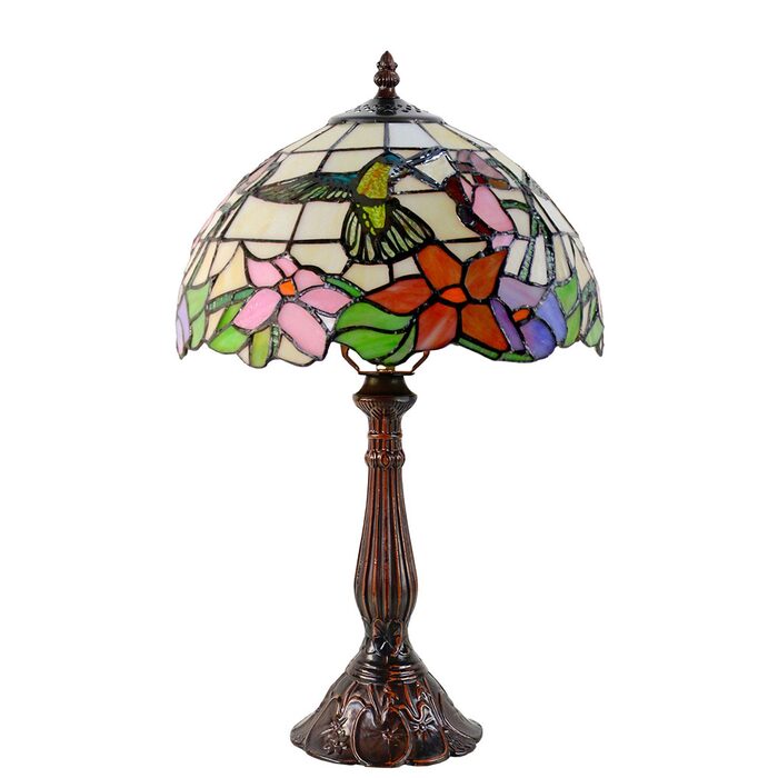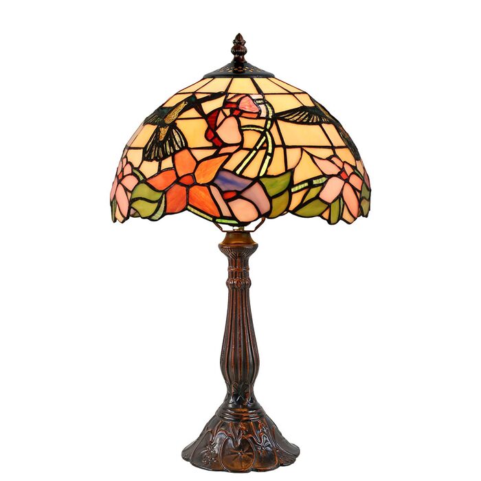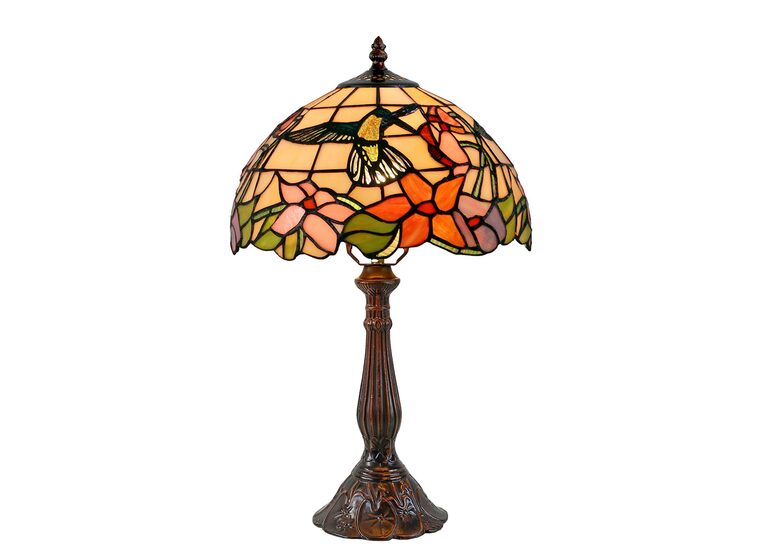 This beautiful Tiffany lamp features a handcrafted, genuine stained art glass shade combined with a resin base, carved in a traditional design with a brown neutral colour to juxtapose the lively art glass shade for maximum impact.