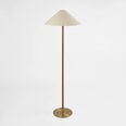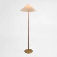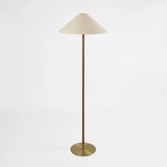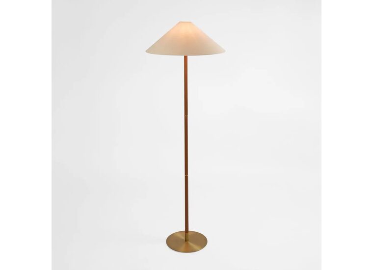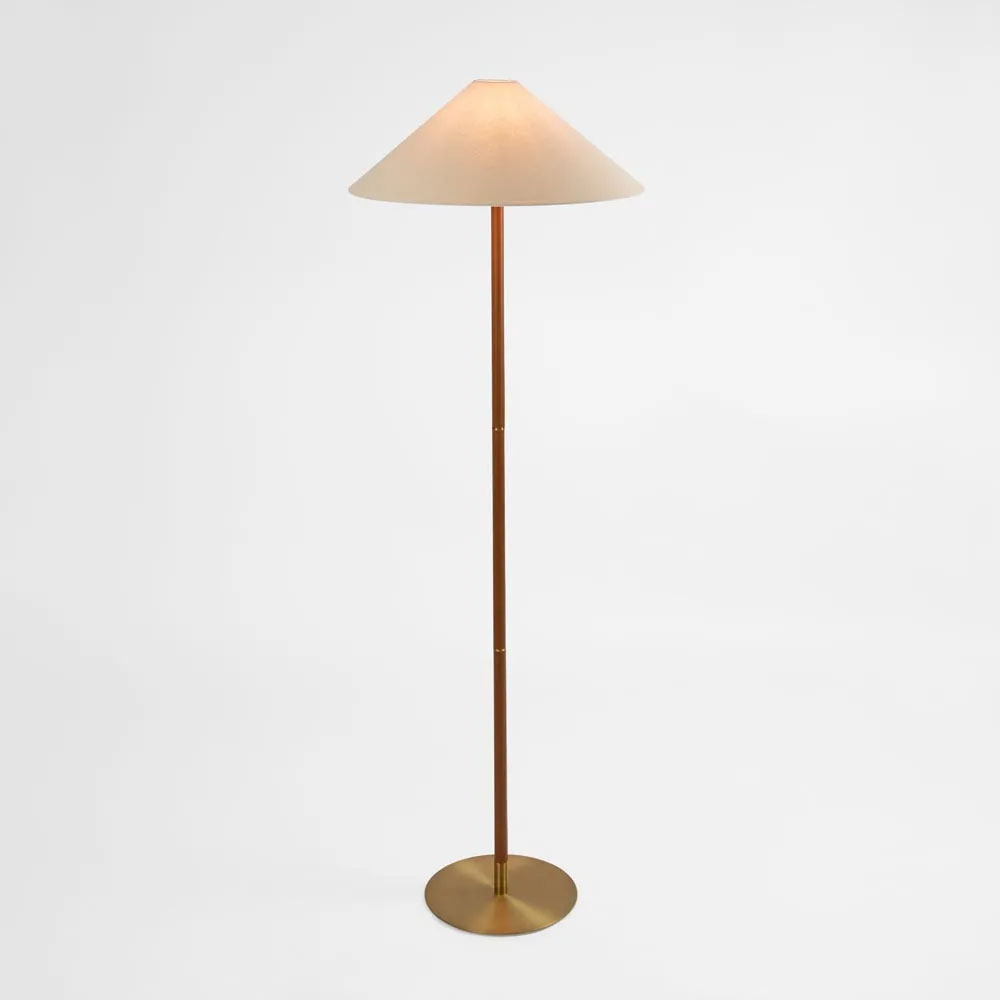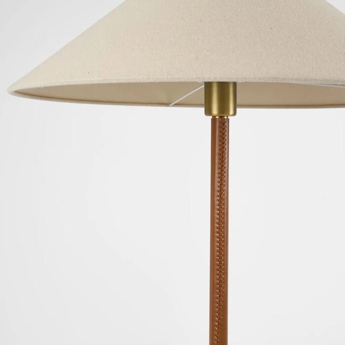 The Huntley Leather & Brass Floor Lamp & Shade exudes elegance with its brushed warm brass finish and leather-look wrap.