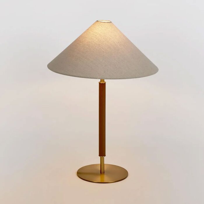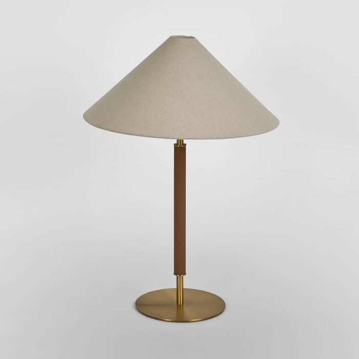 This table lamp hints to Mid Century influences with its hat silhouette shade and elevated via the wrapped leather look finishing of the stand.