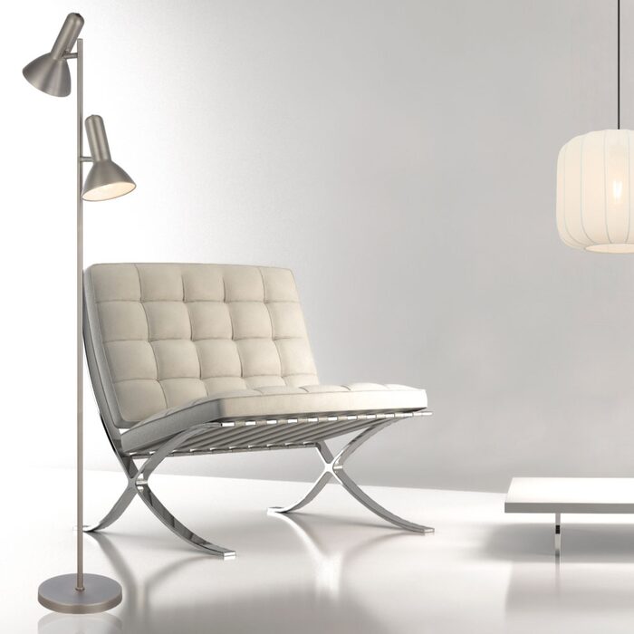 The Hyvik floor lamp, available in black, brass, nickel, and white, features an iron construction with a matte finish.