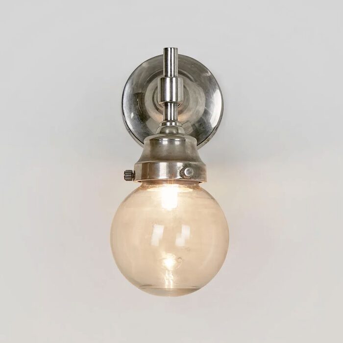 The lamp has a glass round shape and is attached to a wall mount that allows it to be fixed securely to a wall.