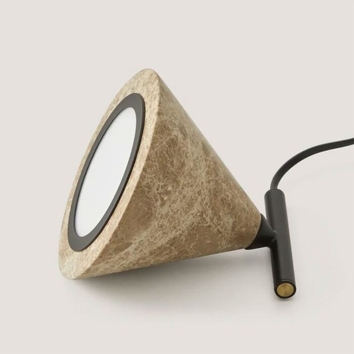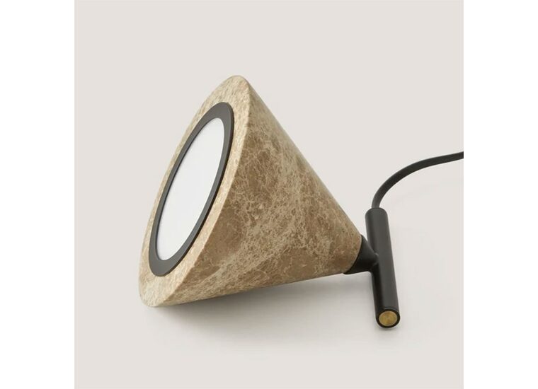 The steel accent is available in matte black and the cone frame is made by a smooth natural-toned marble.
