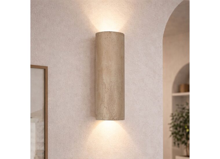 The Impero wall light features a tall, gently curved form in a warm travertino beige finish, giving it a refined, natural look.