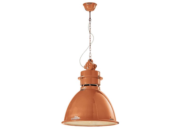 The Industrial 500 mm Pendant Light in Vintage Orange by Ferroluce features a bold design with a distressed finish.