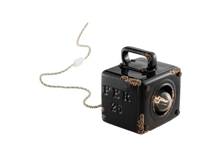 The Industrial 155mm Table Lamp in Vintage Black by Ferroluce features a compact design with a distressed finish.