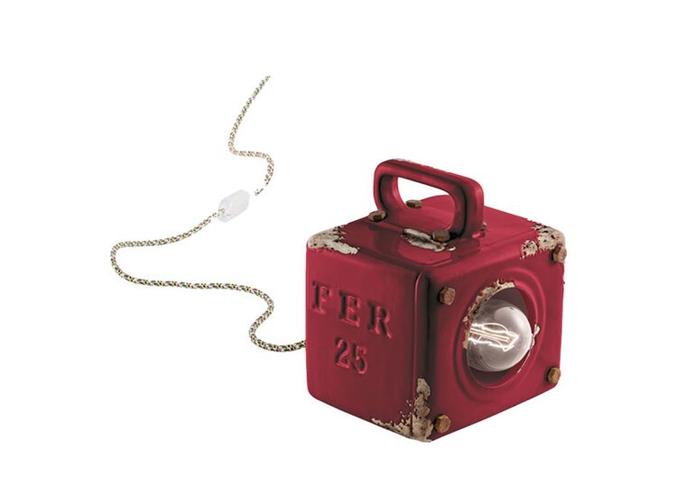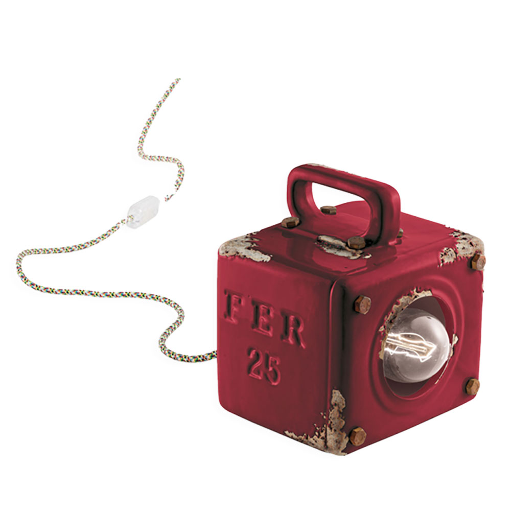 The Industrial 155mm Table Lamp in Vintage Bordeaux by Ferroluce features a compact design with a distressed finish.
